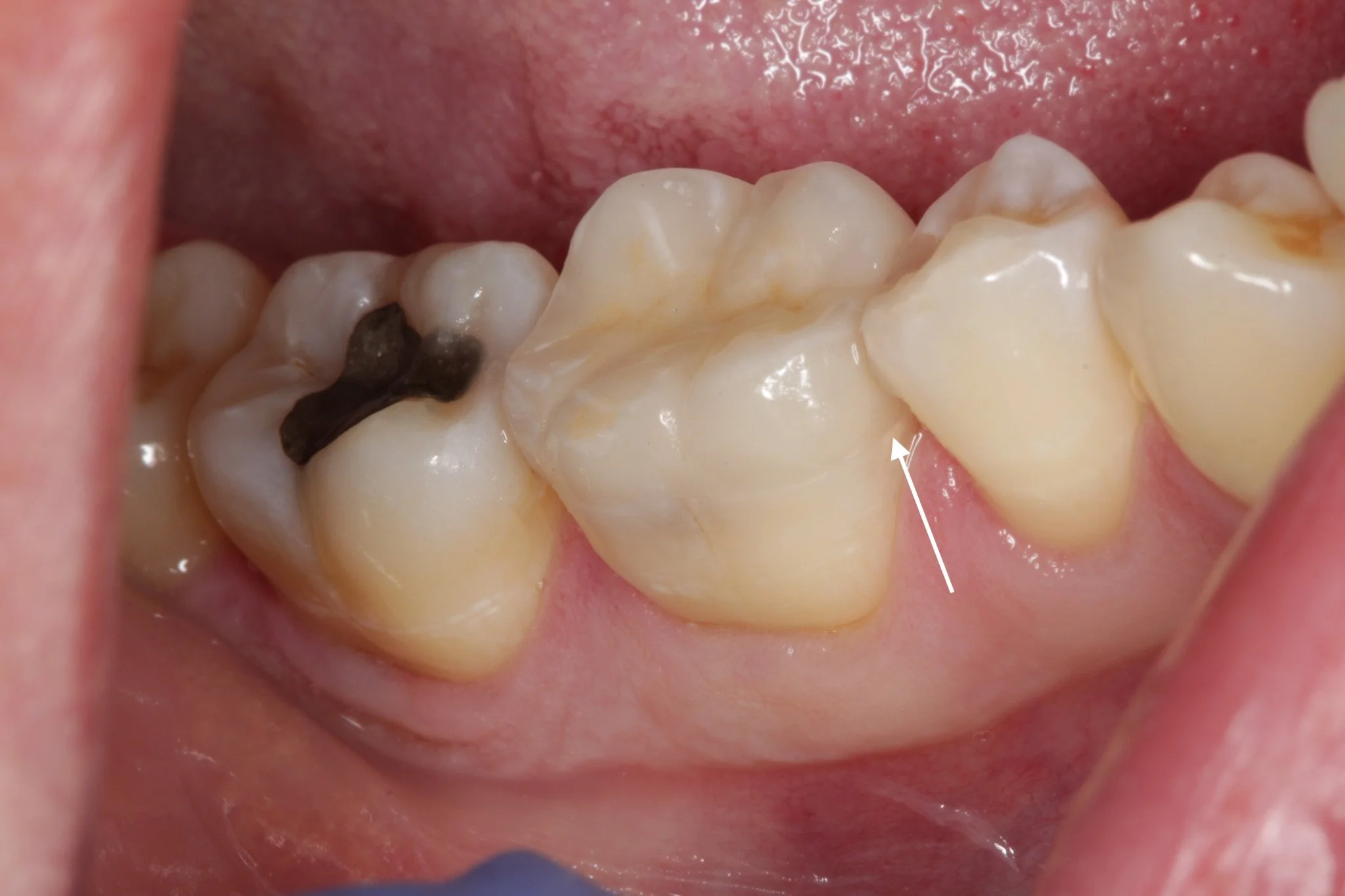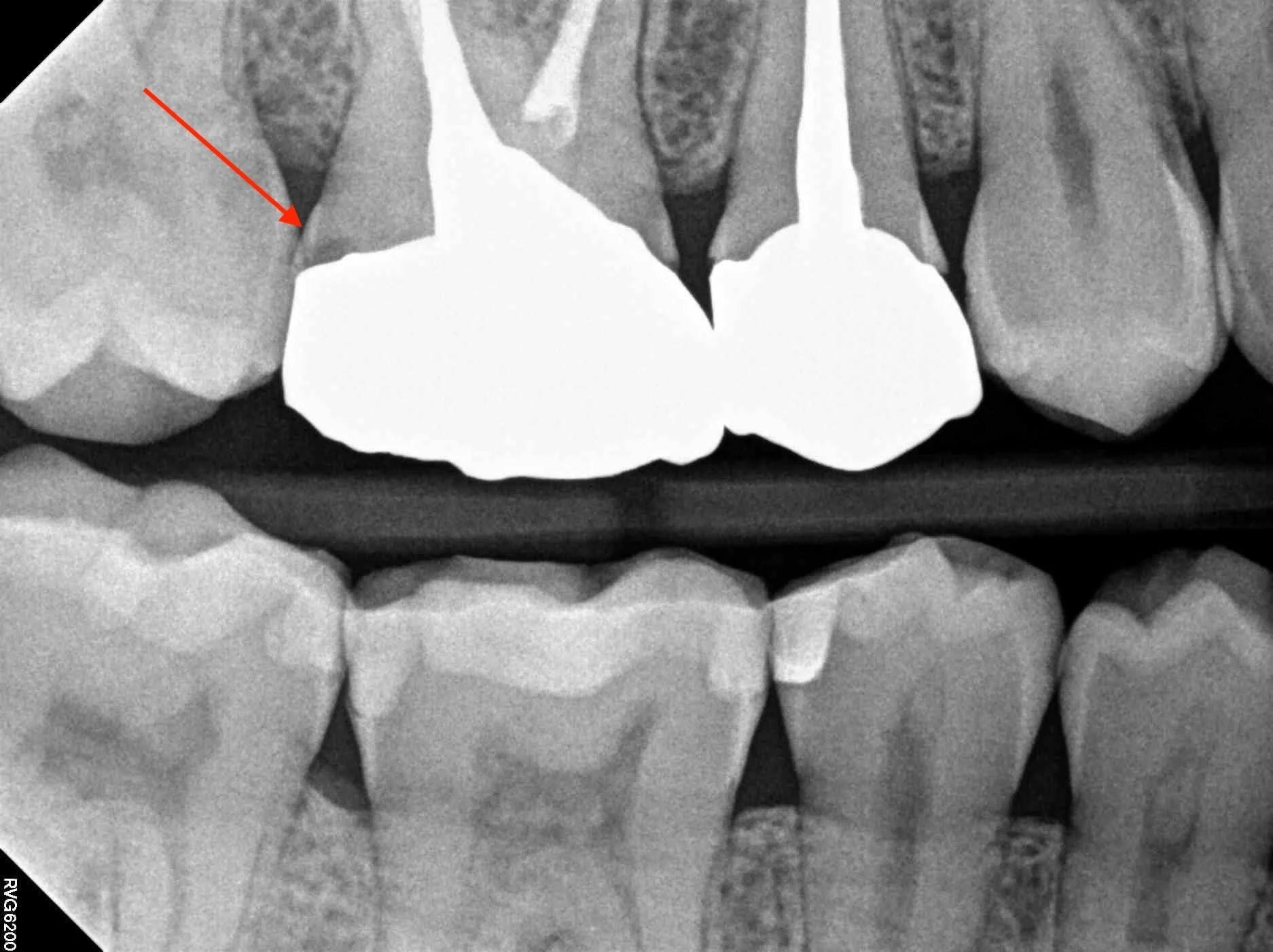 The red arrow shows a gap between this crown and the tooth which can indicate decay - The patient will not feel anything becuase the tooth has no nerve