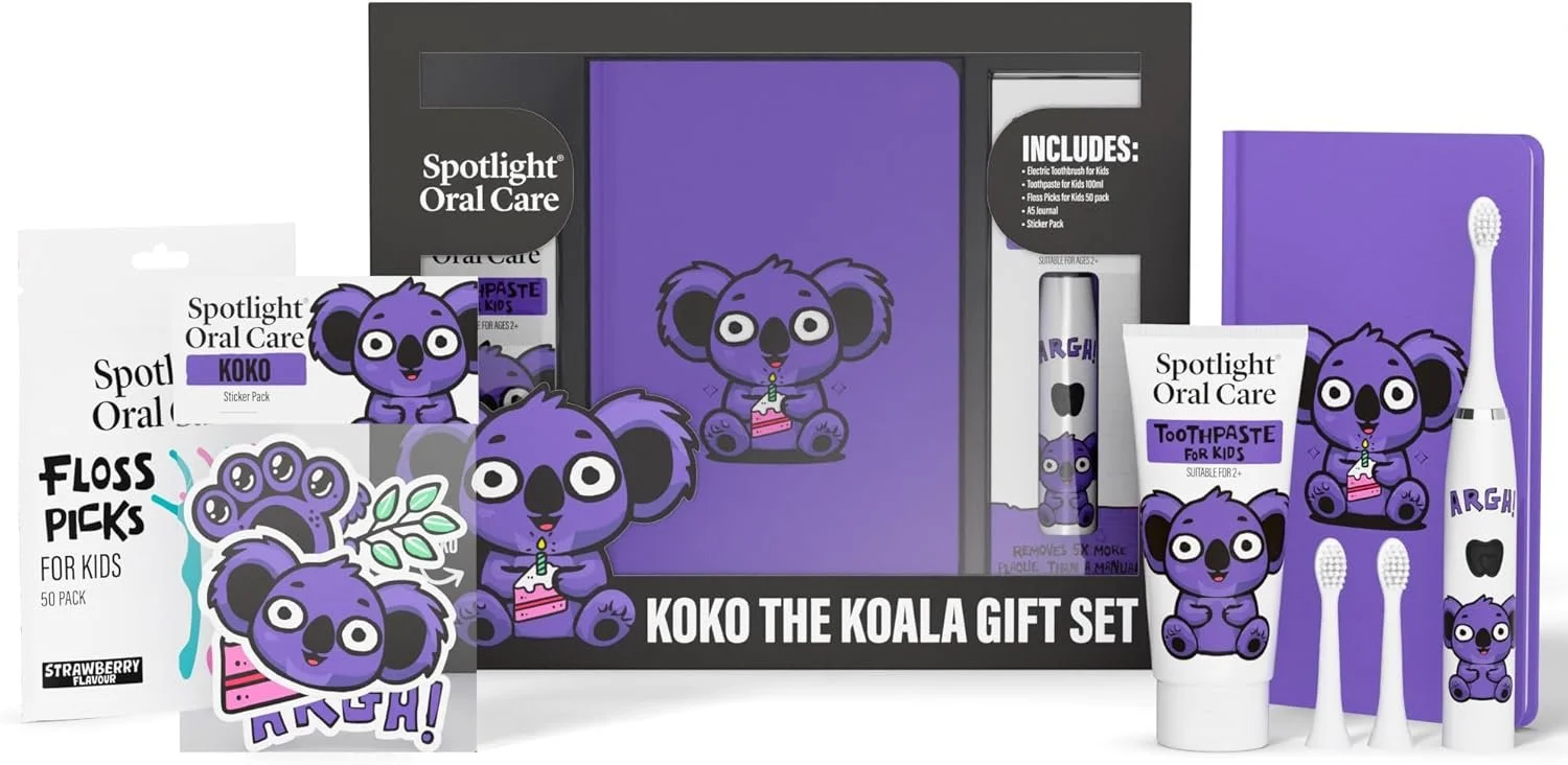 For a complete package bundle that includes everything you’d ever want to help your kids take care of their teeth, look at Spotlight Oral Care’s Koko The Koala gift set. It includes toothpaste, water floss picks and a quality electric toothbrush, as well as fun stickers to help engage young ones with wandering minds.