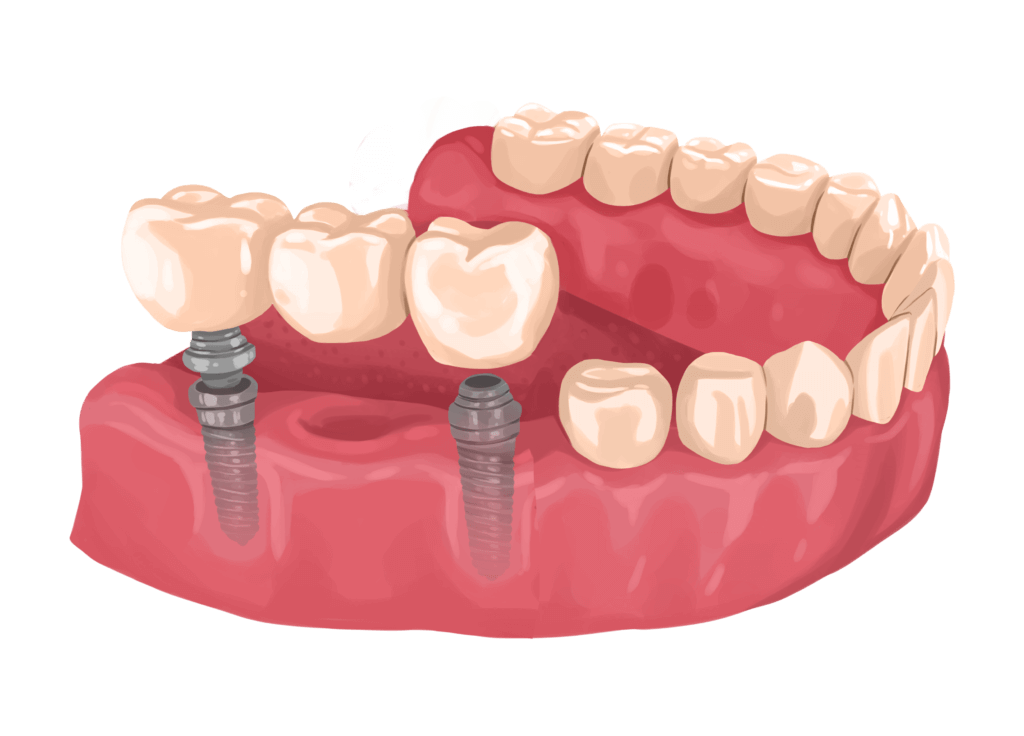 Bigger gaps can be filled with multiple single implants, or with an implant-retained bridge.