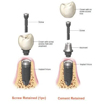 A cement-retained dental implant crown has 2 components, an abutment and the crown. The abutment is screwed into your implant, and the crown is seated using dental cement. These crowns are riskier as excess cement can stay around the margin of the crown and cause inflammation of the gums and bone around the implant. It is also harder to remove and replace cement-retained implant crowns.